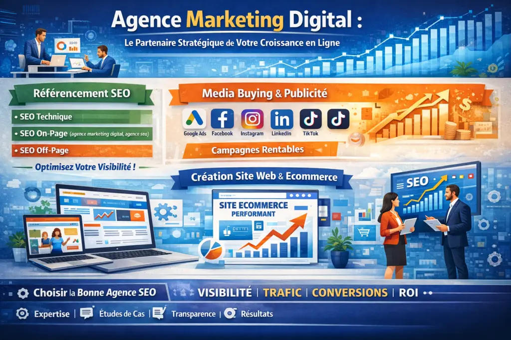 Faire appel à une agence marketing digital est un investissement stratégique pour toute entreprise souhaitant se développer en ligne. Grâce à une combinaison efficace de SEO, Référencement SEO, media buying, creation site web et optimisation d’ecommerce website, vous maximisez votre visibilité et votre rentabilité.